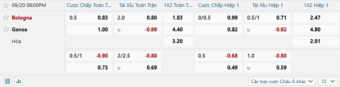 Tip kèo Châu Á full trận Bologna vs Genoa