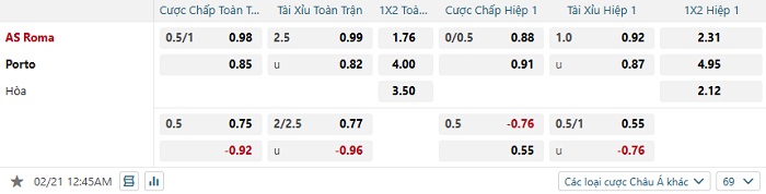 Tip kèo Châu Á hiệp 1 Roma vs Porto