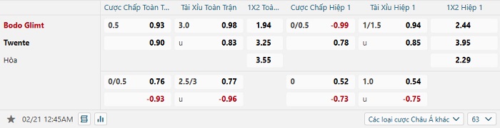 Tip kèo Châu Á hiệp 1 Bodo Glimt vs Twente