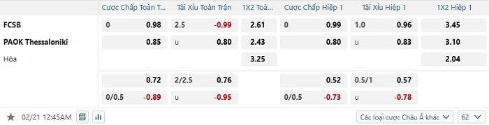 Tip kèo Châu Á hiệp 1 FCSB vs PAOK