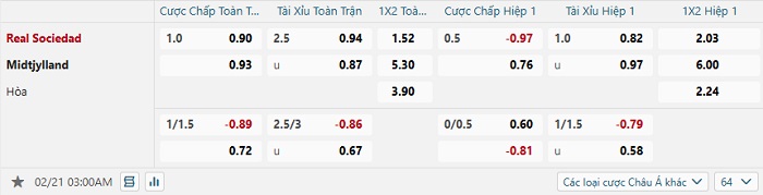 Tip kèo Châu Á full trận Real Sociedad vs Midtjylland