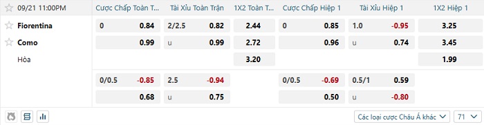 Tip kèo Châu Á hiệp 1 Fiorentina vs Como
