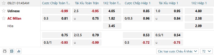 Tip kèo Châu Á hiệp 1 Udinese vs AC Milan