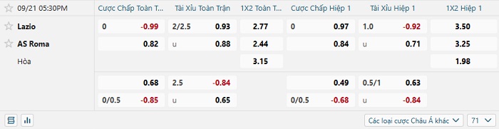 Tip kèo Châu Á hiệp 1 Lazio vs Roma