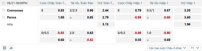 Tip kèo Châu Á full trận Cremonese vs Parma