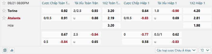 Tip kèo Châu Á hiệp 1 Torino vs Atalanta