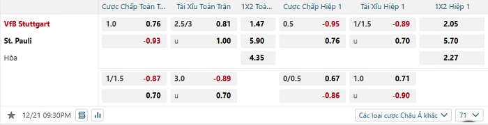 - Tip kèo cá cược Châu Á hiệp 1: Chọn Stuttgart -1/2