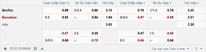 Tip kèo Châu Á full trận Benfica vs Barcelona