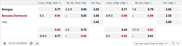 Tip kèo Châu Á hiệp 1 Bologna vs Dortmund