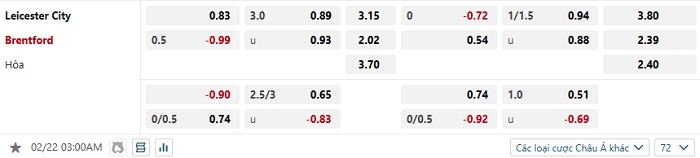 Tip kèo Châu Á full trận Leicester vs Brentford