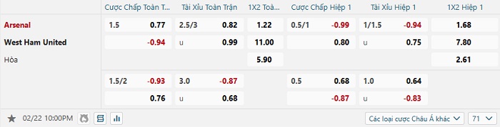 Tip kèo Châu Á full trận Arsenal vs West Ham