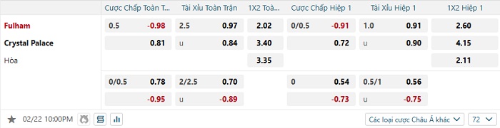 Tip kèo Châu Á full trận Fulham vs Crystal Palace