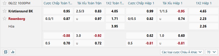 Tip kèo Châu Á hiệp 1 Kristiansund vs Rosenborg