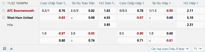 Tip kèo Châu Á hiệp 1 Bournemouth vs West Ham