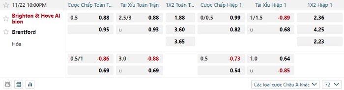 Tip kèo Châu Á hiệp 1 Brighton vs Brentford