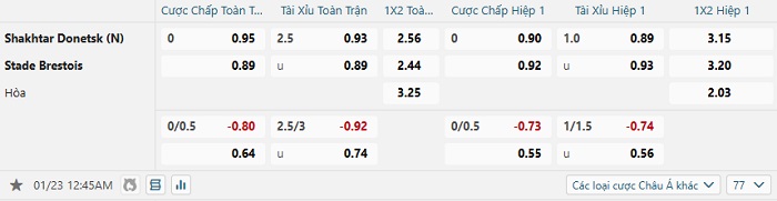 Tip kèo Châu Á hiệp 1 Shakhtar Donetsk vs Brest