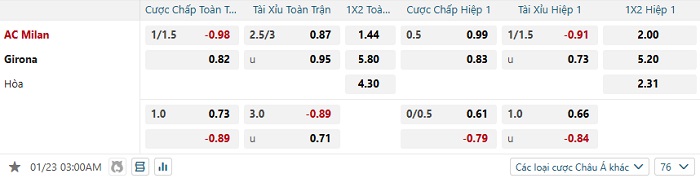 Tip kèo Châu Á hiệp 1 Milan vs Girona