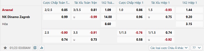 Tip kèo Châu Á full trận Arsenal vs Dinamo Zagreb