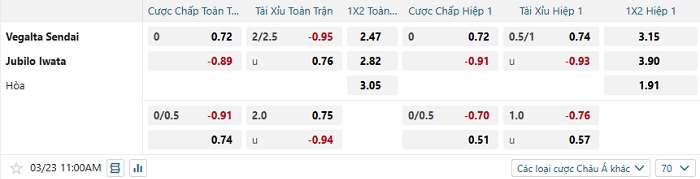 Tip kèo Châu Á hiệp 1 Vegalta Sendai vs Jublio Iwata