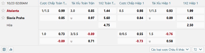 Tip kèo Châu Á hiệp 1 Atalanta vs Slavia Praha