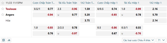 Tip kèo Châu Á hiệp 1 Toulouse vs Angers