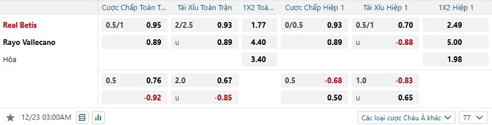 Tip kèo Châu Á full trận Real Betis vs Vallecano