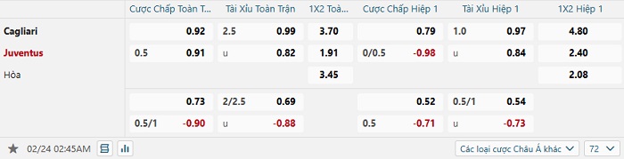 Tip kèo Châu Á hiệp 1 Cagliari vs Juventus