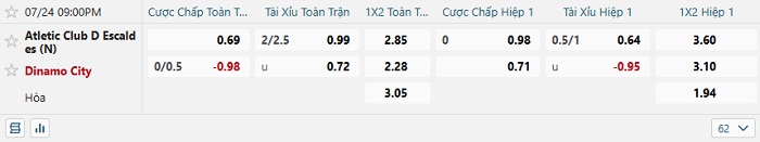 Tip kèo Châu Á full trận Atletic D Escaldes vs Dinamo City
