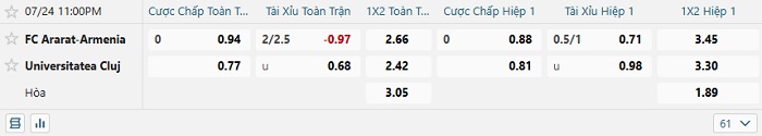 Tip kèo Châu Á hiệp 1 Ararat Armenia vs Universitatea Cluj