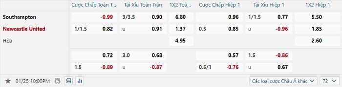 Tip kèo Châu Á hiệp 1 Southampton vs Newcastle