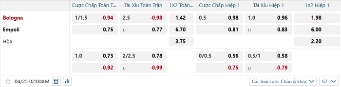 Tip kèo Châu Á full trận Bologna vs Empoli
