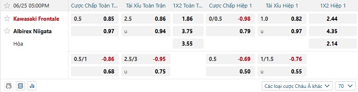 Tip kèo Châu Á hiệp 1 Kawasaki Frontale vs Albirex Niigata