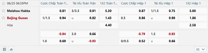Tip kèo Châu Á hiệp 1 Meizhou Hakka vs Beijing Guoan