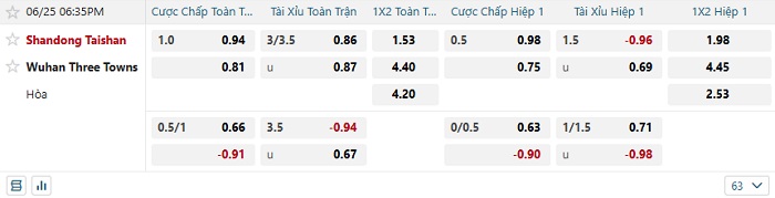 Tip kèo Châu Á full trận Shandong Taishan vs Wuhan Three Towns