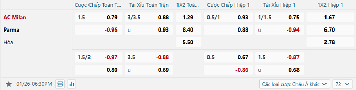 Tip kèo Châu Á hiệp 1 Milan vs Parma