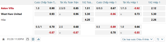 Tip kèo Châu Á full trận Aston Villa vs West Ham