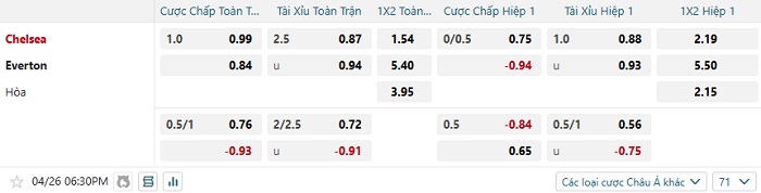 Tip kèo Châu Á hiệp 1 Chelsea vs Everton