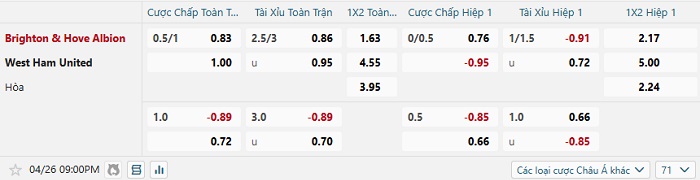 Tip kèo Châu Á hiệp 1 Brighton vs West Ham