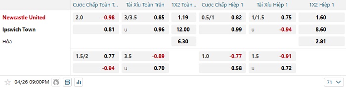 Tip kèo Châu Á full trận Newcastle vs Ipswich
