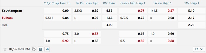 • Dự đoán tỷ số hiệp 1: Southampton 0 – 1 Fulham