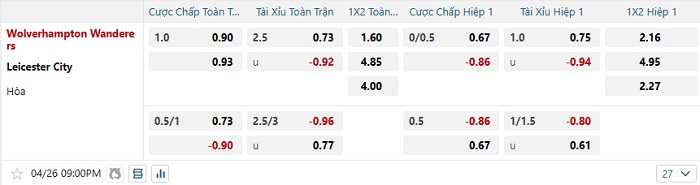 • Dự đoán tỷ số hiệp 1: Wolves 0 – 0 Leicester