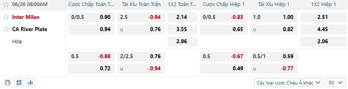 Tip kèo Châu Á full trận Inter Milan vs River Plate