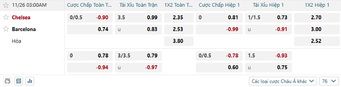 Tip kèo Châu Á hiệp 1 Chelsea vs Barcelona