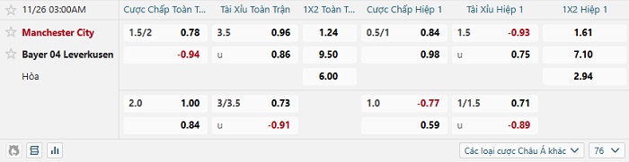 Tip kèo Châu Á full trận Man City vs Bayer Leverkusen