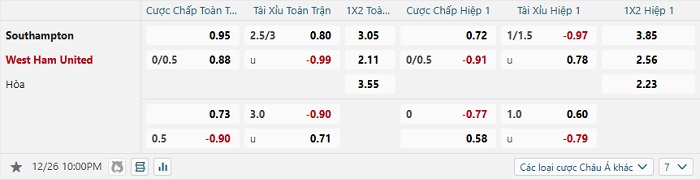Tip kèo Châu Á full trận Southampton vs West Ham