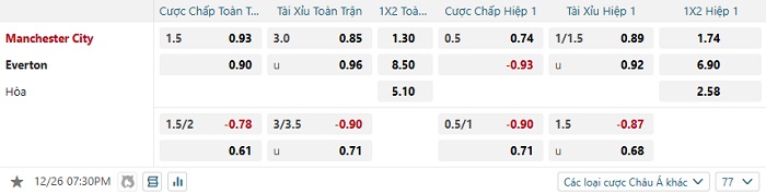 Tip kèo Châu Á hiệp 1 Man City vs Everton