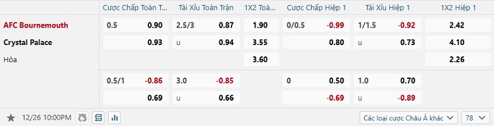 Tip kèo Châu Á full trận Bournemouth vs Crystal Palace
