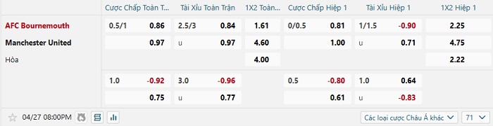 Tip kèo Châu Á hiệp 1 Bournemouth vs Man United