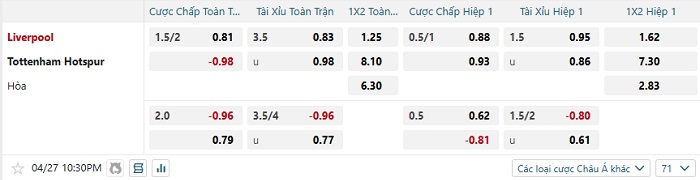 Tip kèo Châu Á hiệp 1 Liverpool vs Tottenham