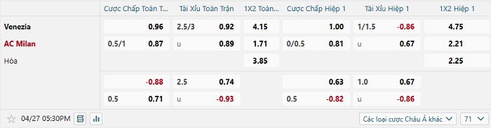 Tip kèo Châu Á full trận Venezia vs Milan